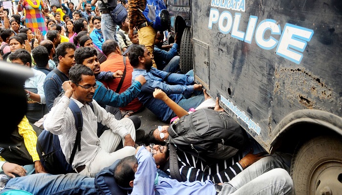 বিক্ষোভ থামাতে পুলিশের লাঠি, গ্যাস, গুলি সবই আগে দেখা গেছে। ভারতের পশ্চিমবঙ্গে এবার দেখা গেল, বিক্ষোভকারীকে কামড়াচ্ছে পুলিশ।