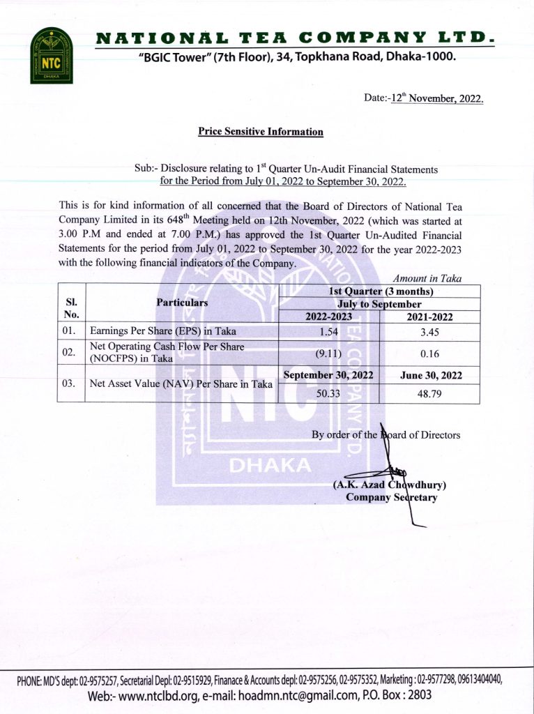 1st Quarter Un-Audit Financial Statements of National Tea Company Ltd.