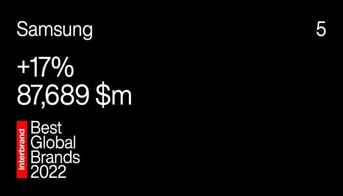 ইন্টারব্র্যান্ডের মতে, স্যামসাং -এর ব্র্যান্ড ভ্যালু ৮৭.৭ বিলিয়ন মার্কিন ডলার মূল্যায়ন করা হয়েছে – গত বছরের বৃদ্ধির তুলনায় ১৭ শতাংশ বেশি, যা ২০২১ সালে ছিলো ৭৪.৬ বিলিয়ন মার্কিন ডলার। এ বিষয়গুলো, প্রতিষ্ঠানটিকে টানা তিন বছর ধরে শীর্ষ পাঁচে জায়গা করে নিতে সক্ষম করেছে।