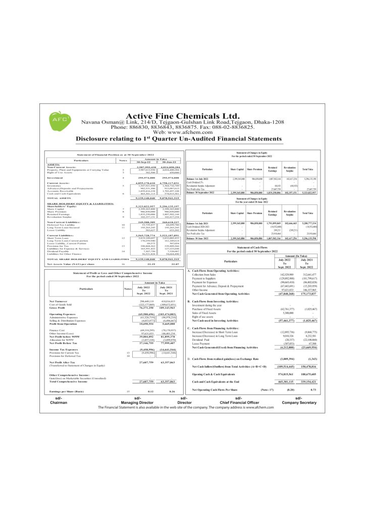 1st Quarter Un-Audited Financial Statements of Active Fine Chemicals Ltd.