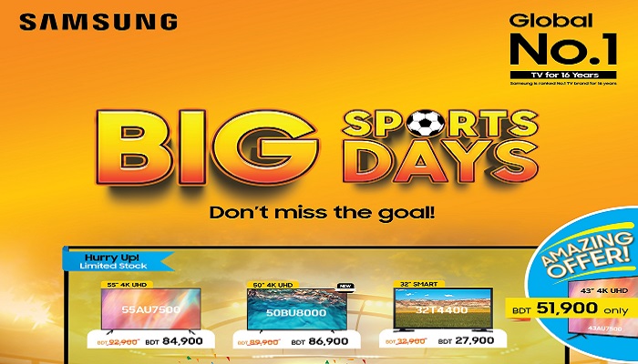 জানা যায়, ‘বিগ স্পোর্টস ডে’ ক্যাম্পেইন চলাকালে স্যামসাং টিভি কিনলে ক্রেতারা দুর্দান্ত ছাড় ও অফার পাচ্ছেন। এর মধ্যে নির্ধারিত কিছু মডেলের টিভির ক্ষেত্রে ২৯,৯০০ টাকা পর্যন্ত মূল্যের সাউন্ডবার বা ১০,৪৯৯ টাকা পর্যন্ত মূল্যের ট্যাব জিতে নিতে পারেন বিনামূল্যে! এছাড়া, কিছু মডেলের টিভিতে ৬,০০০ টাকা পর্যন্ত ক্যাশব্যাক অফারও রয়েছে। এছাড়া ফ্রি হোম ডেলিভারি ও ইন হোম সার্ভিসের মতো সেবাগুলোও পাচ্ছেন গ্রাহকরা। স্যামসাংয়ের যেকোনো অথোরাইজড ডিলার পয়েন্ট থেকে টিভি কিনলেই ক্রেতারা এই সুবিধাগুলো পাবেন। এই ক্যাম্পেইনটি চলবে আগামী ৩১ ডিসেম্বও, ২০২২ পর্যন্ত।