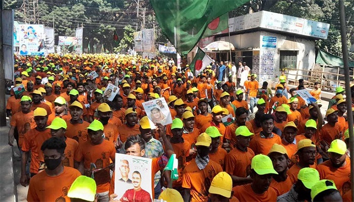 নিজস্ব প্রতিনিধিঃ আওয়ামী লীগ সভাপতি ও প্রধানমন্ত্রী শেখ হাসিনার জনসভায় যোগ দিতে রোববার (৪ ডিসেম্বর) ভোর থেকে বিভিন্ন জেলা, উপজেলা, থানা, ইউনিয়ন পর্যায় থেকে দলে দলে নেতাকর্মীরা খণ্ড খণ্ড মিছিল নিয়ে আসছেন পলোগ্রাউন্ড মাঠে। এ সময় মিছিলগুলোর স্লোগানে প্রাধান্য পায় আওয়ামী লীগ সরকারের নানা উন্নয়ন কর্মকাণ্ড ও নির্বাচনী বার্তা।