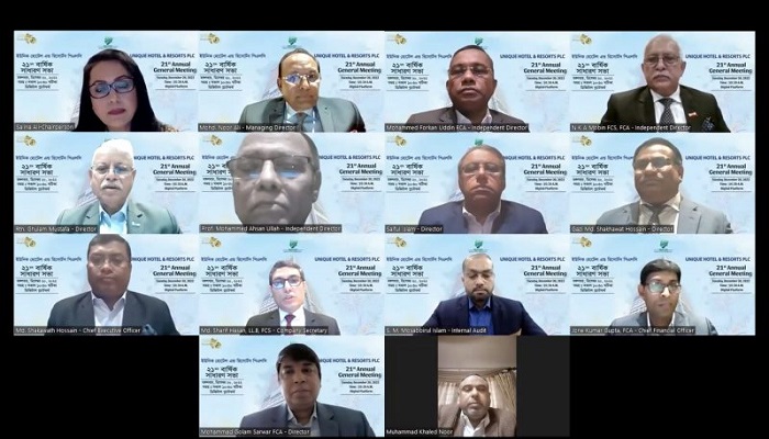 পুঁজিবাজারে তালিকাভুক্ত কোম্পানি ইউনিক হোটেল এন্ড রিসোর্টস পিএলসির ২১তম বার্ষিক সাধারণ সভা অনুষ্ঠিত হয়েছে। মঙ্গলবার (২০ ডিসেম্বর) ডিজিটাল প্লাটফর্মের মাধ্যমে অনুষ্ঠিত এ সভায় উপস্থিত শেয়ারহোল্ডারগন ২০২১-২২ সালের সমাপ্ত বছরের হিসাবের ভিত্তিতে ১৫ শতাংশ নগদ লভ্যাংশ (সকল শেয়ারহোল্ডারদের জন্য) অনুমোদন করেন।
