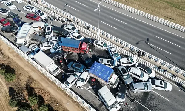 সেখানে কুয়াশার কারণে ৫০০ মিটারের বেশি দূরে দেখা যায় না। চীনের স্থানীয় আবহাওয়া অফিস বলছে, বুধবার সকালে ওই এলাকায় কুয়াশার কারণে দৃষ্টিসীমা ২০০ মিটার নিচে নেমে আসে। এতেই ঘটে দুর্ঘটনা। ধারণা করা হচ্ছে, প্রথমে দুটি গাড়ির সংঘর্ষ হয়েছে। এরপর একের পর এক গাড়ি এসেছে আর একে অপরকে ধাক্কা দিয়েছে।