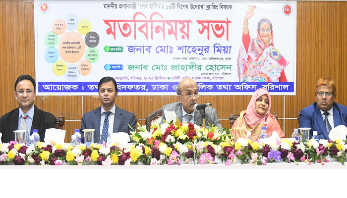 তথ্য অধিদফতর (পিআইডি) ও বরিশাল আঞ্চলিক তথ্য অফিস যৌথভাবে এই মতবিনিময় সভার আয়োজন করে। প্রধান তথ্য অফিসার আরও বলেন, দেশের মানুষের আর্থিক সক্ষমতা বাড়ছে। প্রতি বছর বাজেটের পরিধি বিস্তৃত হচ্ছে। সবই প্রধানমন্ত্রী শেখ হাসিনার সুচিন্তিত নেতৃত্বের ফসল। মতবিনিময় সভায় সভাপতিত্ব করেন জেলা প্রশাসক মো: জাহাঙ্গীর হোসেন। বিশেষ অতিথি ছিলেন পিআইডি’র সিনিয়র উপপ্রধান তথ্য অফিসার খালেদা বেগম ও মুন্সী জালাল উদ্দিন। স্বাগত জানান বরিশাল আঞ্চলিক তথ্য অফিসের উপপ্রধান তথ্য অফিসার ম. জাভেদ ইকবাল ও শেখ হাসিনার ১০টি বিশেষ উদ্যোগ বিষয়ে পাওয়ার পয়েন্টে উপস্থাপন করেন সিনিয়র তথ্য অফিসার মোঃ রিয়াদুল ইসলাম।