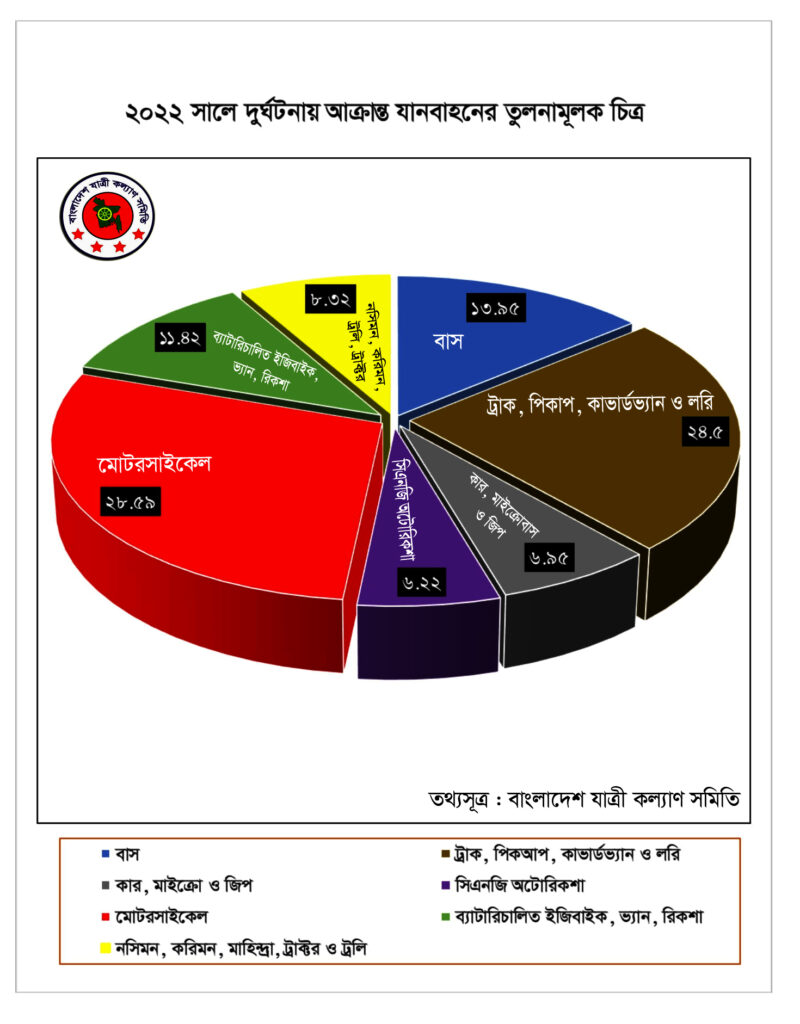 মো. মোজাম্মেল হক চৌধুরী জানান, দেশের জাতীয়, আঞ্চলিক ও অনলাইন সংবাদপত্রে প্রকাশিত সড়ক, রেল ও নৌ-পথে দুর্ঘটনার সংবাদ মনিটরিং করে প্রতি বছরের ধারাবাহিকতায় এই প্রতিবেদন তৈরি করা হয়েছে। এতে দেখা গেছে, বিদায়ী ২০২২ সালে ৬৭৪৯টি সড়ক দুর্ঘটনায় ৯৯৫১ জন নিহত এবং আহত হয়েছেন ১২৩৫৬ জন। ২০২১ সালের চেয়ে ২০২২ সালে সড়কে দুর্ঘটনা ১৯ দশমিক ৮৯ শতাংশ ও প্রাণহানি ২৭ দশমিক ৪৩ শতাংশ বৃদ্ধি পেয়েছে।