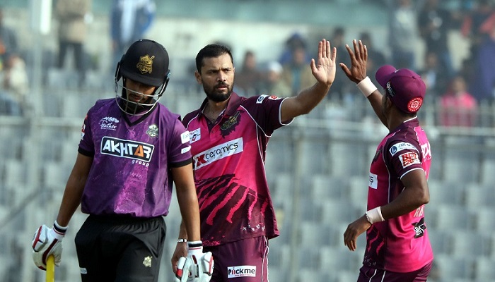 নিজের শেষ ওভারে মৃত্যুঞ্জয় চৌধুরীকে দলীয় ৬৭ রানে আউট করেন মাশরাফি। বাকিদের আসা-যাওয়ার মিছিলে একপ্রান্তে একাই লড়ছিলেন আফিফ হোসেন। কিন্তু ১৬তম ওভারে মোহাম্মদ আমিরের বলে ২৫ রানে উইকেটের পেছনে ক্যাচ দিয়ে বসেন তিনি। ৭৪ রানে ৮ উইকেট হারানো দলটির শঙ্কা জাগে ১০০’র আগে গুটিয়ে যাওয়ার। শেষের দিকে নেমে রাজার গতির সামনে দাড়াতে পারেননি নিহাদউজ্জামানও। ইমাদ ওয়াসিমের তালুবন্দি হয়ে তিনি ফেরেন ৮ রানে। ৪ ওভারে ১৪ রানে ৪ উইকেট নিয়ে স্পেল শেষ করেন রাজা।
