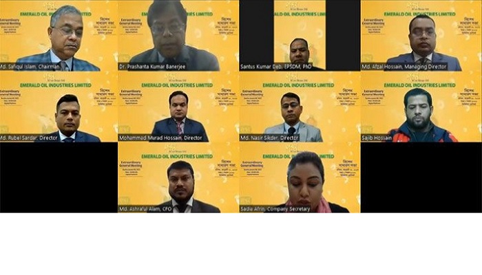পুঁজিবাজারে তালিকাভুক্ত এমারেল্ড অয়েল ইন্ডাস্ট্রিজ লিমিটেডের বিশেষ সাধারণ সভা (ইজিএম) অনুষ্ঠিত হয়েছে। রোববার (০৮ জানুয়ারি) সকাল ১০ টায় কোম্পানিটির চেয়ারম্যান মো. সফিকুল ইসলামের সভাপতিত্বে ডিজিটাল প্লাটফর্মে এ সভা অনুষ্ঠিত হয়।