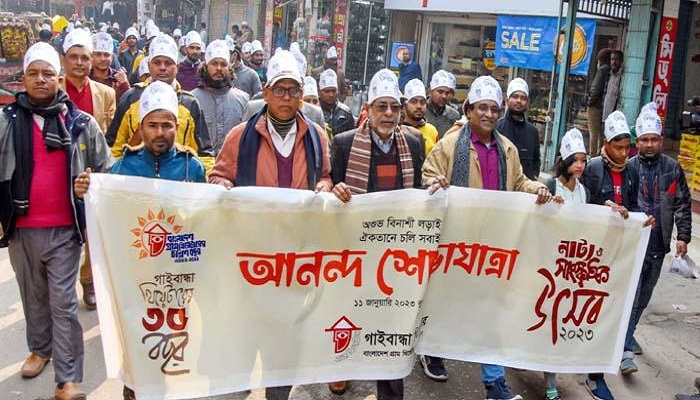 নিজস্ব প্রতিনিধিঃ গাইবান্ধা থিয়েটারের ৩৫ বছর পূর্তি উপলক্ষে গতকাল বুধবার থেকে চারদিনব্যাপী নাট্য ও সাংস্কৃতিক উৎসব শুরু হয়েছে। ‘অশুভ বিনাশী লড়াই ঐকতানে চলি সবাই’ এই শ্লোগানে সকাল ১১টায় শহীদ মিনার চত্বরে দলীয় ও জাতীয় পতাকা উত্তোলন করা হয়। পরে পায়রা উড়িয়ে উৎসবের উদ্বোধন করেন বাংলাদেশ গ্রাম থিয়েটারের সভাপতিমন্ডলীর সদস্য আসাদুল্লাহ ফারাজী। এরপর শহীদ মিনার চত্বর থেকে একটি আনন্দ শোভাযাত্রা বের হয়ে শহরের প্রধান প্রধান সড়ক প্রদক্ষিণ করে পুনরায় সেখানে গিয়ে শেষ হয়।
