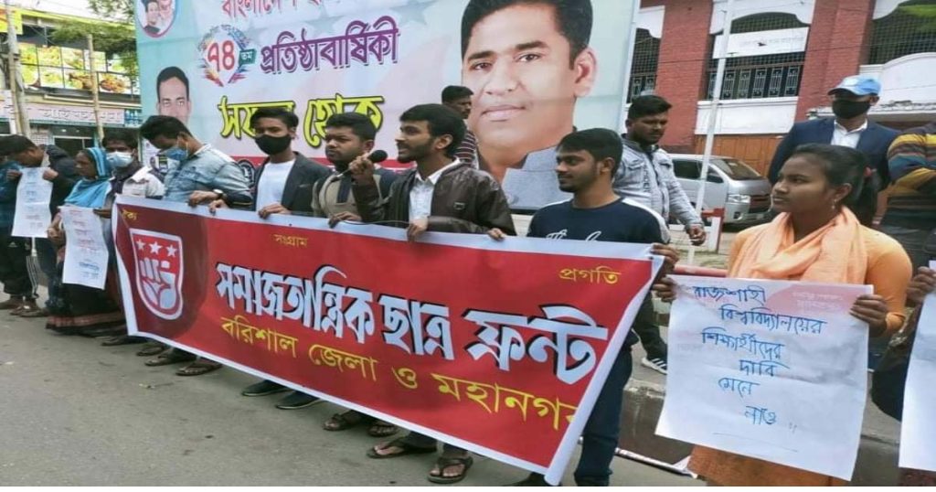 রাজশাহী বিশ্ববিদ্যালয়ে (রাবি) ট্রাকচাপায় শিক্ষার্থী মৃত্যুর প্রতিবাদে বরিশালে বিক্ষোভ সমাবেশ করা হয়েছে। বৃহস্পতিবার বেলা ১১টায় নগরীর অশ্বিনী কুমার হলের সামনে মহানগর ও জেলা সমাজতান্ত্রিক ছাত্র ফ্রন্টের উদ্যোগে এ কর্মসূচী অনুষ্ঠিত হয়।