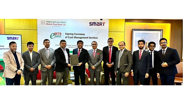 মিউচুয়াল ট্রাস্ট ব্যাংক লিমিটেড (এমটিবি) এবং স্মার্ট টেকনোলজিস (বাংলাদেশ) লিমিটেডের মধ্যে সম্প্রতি এমটিবি’র প্রধান কার্যালয়ে ঢাকায় ক্যাশ ম্যানেজমেন্ট সেবা বিষয়ক একটি চুক্তি স্বাক্ষরিত হয়।