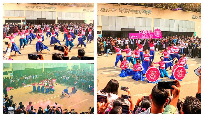 নিজস্ব প্রতিবেদকঃ মহাখালী ব্র্যাক বিশ্ববিদ্যালয় প্রাঙ্গণের এক সুন্দর ও কর্মব্যস্ত দুপুর। শিক্ষার্থীরা কেউ ঘুরে বেড়াচ্ছে, কেউ বা আবার রাস্তা পার হচ্ছে ক্লাস ধরতে। আর আশেপাশের সবাই যে যার গন্তব্যে ছুটছে। কিন্তু হঠাৎ একটি বিষয় সবার নজর কেড়ে নিল। অনুপ্রেরণার বাণী নিয়ে রঙিন ধোঁয়া উড়িয়ে ছুটে আসে একদল নৃত্যশিল্পী, অনুষ্ঠিত হয় অসাধারণ এক ফ্ল্যাশমব বা পথনৃত্য। ব্র্যাকের ৫০ বছর পূর্তি উপলক্ষে অনুষ্ঠিত হতে যাওয়া ‘হোপ ফেস্টিভ্যাল’-এর আগমনী বার্তা দিতেই এই আয়োজন। ব্র্যাক বিশ্ববিদ্যালয় প্রাঙ্গণে অনিন্দ্যসুন্দর এই নৃত্য পরিবেশন করেছেন নৃত্যশিল্পী প্রান্তিক দেব ও তাঁর দল।