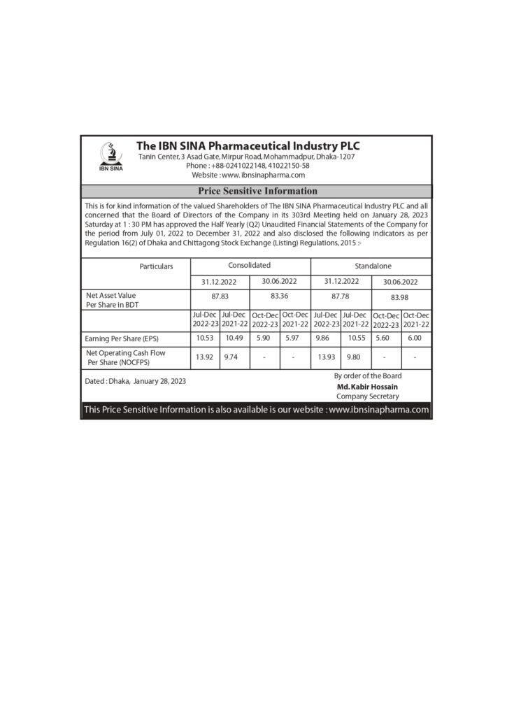 Price Sensitive Information of The IBN SINA Pharmaceutical Industry Ltd.