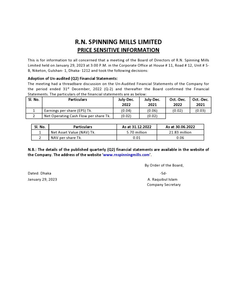 Price Sensitive Information of R.N. Spinning Mills Limited