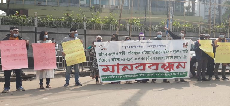 মানববন্ধনে লিখিত বক্তব্যে বলা হয়, ব্যাংকার্স সিলেকশন কমিটি সচিবালয় কর্তৃক প্রকাশিত সমন্বিত পাঁচ ব্যাংক ও আর্থিক প্রতিষ্ঠানের সাধারণ কর্মকর্তা ২৫৭৪টি পদের বিপরীতে তিন দফায় (মেধা তালিকা ও দুটি প্যানেল) চূড়ান্ত ফলাফল প্রকাশ করা হয়। সংশ্লিষ্ট প্রতিষ্ঠানগুলোর দেওয়া তথ্যমতে আমরা যতদূর জানতে পেরেছি মেধাতালিকা ও দুটি প্যানেল দেওয়ার পরও প্রায় ৪০০টির বেশি পদ এখনাে শূন্য রয়েছে। সেসব শূন্যপদ পূরণের লক্ষ্যে পাঁচ ব্যাংক/আর্থিক প্রতিষ্ঠান এরই মধ্যে ব্যাংকার্স সিলেকশন কমিটি সচিবালয়ে তাদের চাহিদাপত্র পাঠিয়েছে। এ অবস্থায় তৃতীয় প্যানেল (৪র্থ পর্যায়) থেকে নিয়ােগ প্রদানের দাবি জানাই।