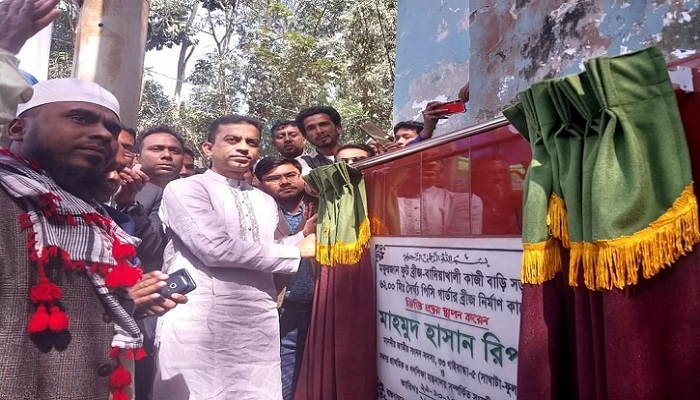 নিজস্ব প্রতিনিধিঃ গাইবান্ধার সাঘাটা উপজেলার বাদিয়াখালী কাজি বাড়ি সড়কে মফুজান ফুট ব্রিজ নির্মাণ কাজের ভিত্তিপ্রস্তর স্থাপন করা হয়েছে। স্থানীয় সরকার প্রকৌশল অধিদপ্তরের অধীনে প্রায় ৫ কোটি টাকা ব্যয়ে ৬২ মিটার দৈর্ঘ্য এ ব্রিজের উদ্বোধন করেন গাইবান্ধা-৫ আসনের সংসদ সদস্য ও প্রাথমিক ও গণশিক্ষা মন্ত্রণালয় সম্পর্কিত স্থায়ী কমিটির সদস্য মাহমুদ হাসান রিপন। এ সময় তিনি বলেন, আওয়ামী লীগ সরকারে আছে বলেই দেশে অভুক্তপূর্ব উন্নয়ন হয়েছে।