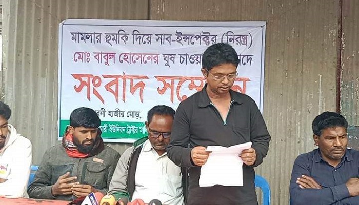 আরও জানা যায়, ধুবনী হাজীর মোড় এলাকার ভুক্তভোগী ওই ট্রাক্টর মালিকদের নাম তিস্তা নদী থেকে অবৈধ বালু উত্তোলনের সেই মামলায় এজাহার ভুক্ত করার ভয় দেখান উপ-পরিদর্শক বাবুল হোসেন। এ সময় ভুক্তভোগীদের কাছ থেকে ঘুষ দাবি করেন তিনি। ভুক্তভোগীরা টাকা দিতে অপারগতা প্রকাশ করলে তাদেরকে মিথ্যা মামলা দিয়ে হয়রানি করার হুমকি দেয়া হয় বলে সংবাদ সম্মেলনে দাবি করেন ভুক্তভোগীরা।