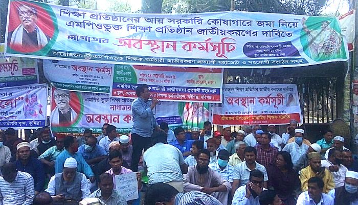 নিজস্ব প্রতিবেদকঃ এমপিওভুক্ত শিক্ষক-কর্মচারী জাতীয়করণ প্রত্যাশী মহাজোটের নেতৃত্বে গত ২৪ ফেব্রুয়ারি থেকে জাতীয় প্রেস ক্লাবের সামনে এমপিওভুক্ত শিক্ষা জাতীয়করণের একদফা দাবিতে লাগাতার অবস্থান কর্মসূচি চলছে। সমগ্র দেশ থেকে কয়েক হাজার শিক্ষক-কর্মচারী প্রতিনিধিবৃন্দ এ আন্দোলনে অংশগ্রহণ করেছে।