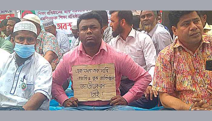 নিজস্ব প্রতিবেদকঃ এমপিওভুক্ত শিক্ষক-কর্মচারী জাতীয়করণ প্রত্যাশী মহাজোটের নেতৃত্বে গত ২৪ ফেব্রুয়ারি থেকে জাতীয় প্রেসক্লাবের সামনে এমপিওভুক্ত শিক্ষা জাতীয়করণের দাবিতে লাগাতার অবস্থান কর্মসূচি চলছে। সমগ্র দেশ থেকে কয়েক হাজার শিক্ষক-কর্মচারীর প্রতিনিধিবৃন্দ প্রতিদিনই অবস্থান কর্মসূচিতে অংশগ্রহণ করছে। অবস্থান কর্মসূচির ৬ষ্ঠ দিনে শিক্ষকরা তাদের বক্তব্যে বলেন, বাবন্ধু বলতেন- পৃথিবীতে দু'টি শ্রেণি রয়েছে শাসক এবং শোষিত। আমি সর্বদা শোষিতের পক্ষে। তাঁর বক্তব্যের প্রতিফলন এমপিওভুক্ত শিক্ষকদের ক্ষেত্রে প্রযোজ্য নয় বলে শিক্ষকরা মনে করেন। আজকে এমপিওভুক্ত শিক্ষকদেরকে এনটিআরসিএ থেকে নিযোগ প্রদান করলেও এমপিওভুক্ত হতে উপজেলা মাধ্যমিক শিক্ষা। কর্মকর্তা, জেলা শিক্ষা কর্মকর্তা এবং ডিডি পর্যন্ত ঘুষ প্রদান করতে হয়। একজন শিক্ষককে এধরনের অনৈতিক কাজ করতে বাধ্য করা হয় শুধু এমপিওভুক্ত শিক্ষা জাতীয়করণ না হওয়ার কারণে। সারাদেশে শিক্ষা নিয়ে এক শ্রেণির মানুষ ব্যবসা করছে। এ ব্যবসা বন্ধের পথ হলো এমপিওভুক্ত শিক্ষা জাতীয়করণের বিষয়টি নিশ্চিত করা। শিক্ষায় গ্রাম-শহরের বৈষম্য নিরসন, সমমানের শিক্ষা ব্যবস্থা স্বাধীন বাংলাদেশে চালুকরণের একমাত্র পথই হলো এমপিওভুক্ত শিক্ষা জাতীয়করণ। মেধাবীদের শিক্ষাকতায় আকৃষ্ট করতে হলে এমপিওভুক্ত শিক্ষা জাতীয়করণের বিকল্প নেই। শিক্ষকদের প্রত্যাশা ছিল বর্তমান সরকার মুজিব বর্ষকে অর্থবহ করতে এবং স্বাধীনতার সুবর্ণ জয়ন্তীকে স্মরনীয় করতে ২০২২-২০১৩ অর্থ বছরে এমপিওভুক্ত শিক্ষা জাতীয়করণ করবেন। কিন্তু এখনও বিষয়টি আলোর মুখ না দেখায় শিক্ষকগণ হতাশ ও ক্ষুব্ধ। সরকার আগামী নির্বাচনের জন্য স্মার্ট বাংলাদেশ গড়ার পরিকল্পনা গ্রহণ করেছে। স্মার্ট বাংলাদেশ গড়তে হলে স্মার্ট শিক্ষকদের মাধ্যমে শিক্ষা পরিচালনা করতে হবে না এমপিওভুক্ত শিক্ষা জাতীয়করণের মাধ্যমেই সম্ভব। জোটের আহব্বায়ক অধ্যক্ষ মোঃ মাইন উদ্দীন ও সদস্য সচিব জসিম উদ্দিন আহমদ বলেন, বঙ্গবন্ধু বেঁচে থাকলে অনেক আগেই এমপিওভুক্ত শিক্ষা জাতীয়করণ হয়ে যেত। আজকের প্রেক্ষাপটে এমপিওভুক্ত শিক্ষা জাতীয়করণ করতে হলে এখনই রাজনৈতিক সিদ্ধারসহ সরকার প্রধানের সদিচ্ছার প্রযোজন, যা বাংলাদেশ আওয়ামীলীগ এবং সরকার প্রধান হিসেবে জননেত্রী শেখ হাসিনাই নিতে পারেন। আমাদের বিশ্বাস, আমাদের স্লোগান- শিক্ষা প্রতিষ্ঠানের আয় সরকারি কোষাগারে জমা দিন এমপিওভুক্ত শিক্ষা জাতীয়করণ করে দিন। মাননীয় প্রধানমন্ত্রী মানবতার মা, বঙ্গবন্ধ কন্যা শেখ হাসিনা তার ঘোষণায় অনতি বিলম্বে এমপিওভুক্ত শিক্ষা জাতীয়করণের ঘোষণা দিয়ে শিক্ষকদেরকে জাতীয় প্রেসক্লাবের সামনে থেকে শিক্ষা প