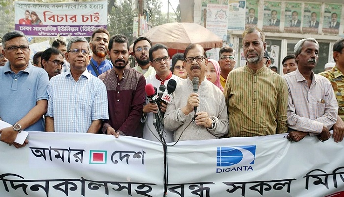 বৃহস্পতিবার (২ মার্চ) জাতীয় প্রেস ক্লাবের সামনে বাংলাদেশ সিভিল রাইটস সোসাইটি (বিসিআরএস) আয়োজিত বিক্ষোভ সমাবেশে এসব কথা বলেন তিনি। দৈনিক দিনকালসহ বন্ধ সব মিডিয়া খুলে দেওয়ার দাবিতে এ বিক্ষোভ সমাবেশের আয়োজন করা হয়।