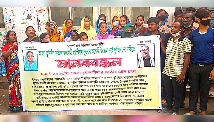 রাষ্ট্রের চলমান উন্নয়নে হরিজন ও তেলেগুরা অন্তরায় নহে। আমরা এই মানব বন্ধন থেকে মমতাময়ী, মাননীয় প্রধানমন্ত্রীকে জানাতে চাই আমরা ভূমিহীন আমাদের বেঁচে থাকার জন্য গোপীবাগ রেলওয়ে হরিজন ও তেলেগু কলোনীর অসহায় হরিজন ও তেলেগুদের পূর্নবাবসন করে রাষ্ট্রের উন্নয়নের কাজ সম্পন্ন হোক।