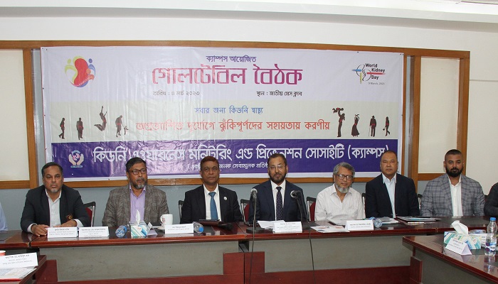 ‘‘বিশ্ব কিডনি দিবস-২০২৩’’ উদযাপন উপলক্ষ্যে আয়োজিত কর্মসূচীর অংশ হিসেবে দেশের শীর্ষস্থানীয় কিডনি বিষয়ক বেসরকারী স্বেচ্ছাসেবী সংস্থা কিডনি এওয়ারনেস মনিটরিং এন্ড প্রিভেনশন সোসাইটি (ক্যাম্পস), ০৪ মার্চ (শনিবার) জাতীয় প্রেস ক্লাবের তফাজ্জল হোসেন মানিক মিয়া হলে এক গোলটেবিল বৈঠকের আয়োজন করে।