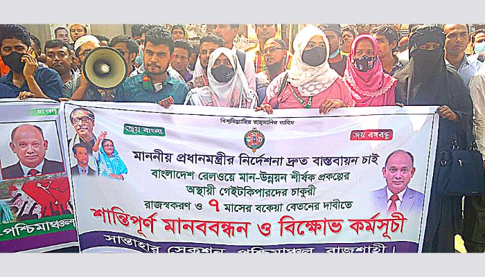 বাংলাদেশ রেলওয়ের মান উন্নয়ন শীর্ষক প্রকল্পের ১৮৮৯ জন গেইট কিপারের চাকরি রাজস্ব খাতে স্থায়ীকরণের দাবিতে বীর মুক্তিযোদ্ধার সন্তান ও বেলপোষ্য এবং বাংলাদেশ রেলওয়ে ১৮৮৯ জন গেইট কিপার রাজস্বকরণ বাস্তবায়ন ঐক্য পরিষদ পূর্ব ও পশ্চিম অঞ্চল’ এর উদ্যোগে কমলাপুর রেলওয়ে প্রশাসনিক ভবনের সামনে গত ২৭ ফেব্রুয়ারি শুরু হওয়া অনির্দিষ্টকালের আমরণ অনশন আজ ১৫ মার্চ ২০২২ মঙ্গলবার ১৭তম দিনে বাংলাদেশ জাতীয় শ্রমিকলীগের ভারপ্রাপ্ত সভাপতি নূরে কুতুব আলম মান্নান, সাধারণ সম্পাদক এ কে এম আজম খসরু, জাতীয় শ্রমিক লীগের সিনিয়র সহ সভাপতি ও রেলওয়ে শ্রমিক লীগের সভাপতি হুমায়ূন কবির, জাতীয় শ্রমিক লীগের সিনিয়র সহ সভাপতি ও রেলওয়ে শ্রমিক লীগের সাধারণ সম্পাদক আলহাজ্ব হাবিবুর রহমান আকন্দ, জাতীয় শ্রমিক লীগের প্রচার ও প্রকাশনা সম্পাদক ও রেলওয়ে শ্রমিক লীগের অতিরিক্ত সাধারণ সম্পাদক মোঃ মেহেদী হাসান, বাংলাদেশ রেলওয়ে শ্রমিক লীগের যুগ্ম সাধারণ সম্পাদক এম এ এফ সুমন, রেলওয়ে শ্রমিক লীগের দপ্তর সম্পাদক শাহজাহান পাটোওয়ারী সাজু, রেলওয়ে শ্রমিক লীগের প্রচার ও প্রকাশনা সম্পাদক কামাল হোসেন এবং জাতীয় শ্রমিক লীগ ও রেলওয়ে শ্রমিক লীগের সকল নেতাকর্মীদের উপস্থিতিতে রেলওয়ে গেইট কিপারদের দাবীর সাথে একাত্মতা পোষন করে, দাবী পূরণের আশ্বাস দিয়ে চলমান অনশনের সাময়িক স্থগিত ঘোষনা করেন এবং বাংলাদেশ জাতীয় শ্রমিক লীগের সভাপতি নূরে কুতুব আলম মান্নান বলেন মাননীয় প্রধানমন্ত্রীর আদেশ এবং একনেক সভার নির্দেশনা মোতাবেক আগামী ০৩ (তিন) মাসের মধ্যে যদি রেলওয়ে গেইট কিপারদের দাবী পুরণ করা না হয় তাহলে আমরা জাতীয় শ্রমিক লীগ রেলওয়ে গেইট কিপারদের নিয়ে কঠোর আন্দোলন করবো।
