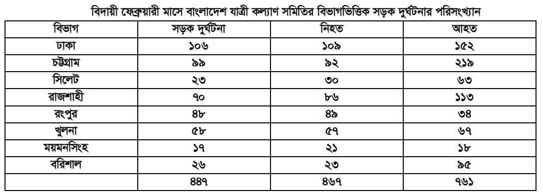নিজস্ব প্রতিবেদক: বিদায়ী ফেব্রুয়ারী মাসে ৪৪৭ টি সড়ক দুর্ঘটনায় ৪৬৭ জন নিহত, ৭৬১ জন আহত হয়েছে। একই সময় রেলপথে ৪৬ টি দুর্ঘটনায় ৩৯ জন নিহত, ০৭ জন আহত হয়েছে। নৌ-পথে ১৪ টি দুর্ঘটনায় ১৬ জন নিহত, ২৭ জন আহত এবং ১৫ জন নিখোঁজ হয়েছে। সড়ক, রেল ও নৌ-পথে সর্বমোট ৫০৭ টি দুর্ঘটনায় ৫২২ জন নিহত এবং ৭৯৫ জন আহত হয়েছে। এ মাসে ১৫৪ টি মোটরসাইকেল দুর্ঘটনায় ১৫৯ জন নিহত, ৮২ জন আহত হয়েছে। বাংলাদেশ যাত্রী কল্যাণ সমিতির দুর্ঘটনা মনিটরিং সেলের দুর্ঘটনা পর্যবেক্ষণ প্রতিবেদনে এই তথ্য উঠে এসেছে।
