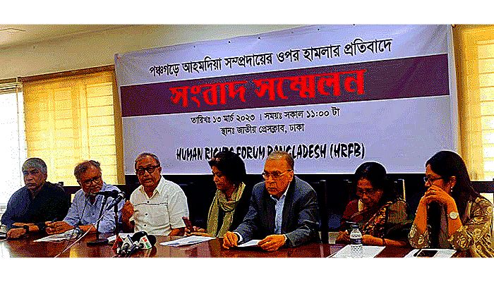 হিউম্যান রাইটস ফোরাম বাংলাদেশ (এইচআরএফবি) আয়োজিত সংবাদ সম্মেলনে লিখিত বক্তব্য পাঠ করেন আইন ও সালিশ কেন্দ্রের সমন্বয়কারী তামান্না হক রিতী। তিনি বলেন, গত ৩ মার্চ পঞ্চগড়ে আহমদিয়া সম্প্রদায়ের সালান জলসা বন্ধের দাবিতে মহাসড়ক অবরোধ ও আহমদিয়া সম্প্রদায়ের উপর হামলা, ঘর-বাড়ি ও ব্যবসা প্রতিষ্ঠান, ভাঙচুর, লুটপাট ও আগুনে পোড়ানোর ঘটনা ঘটেছে। এই ঘটনায় আইনশৃঙ্খলা রক্ষাকারী বাহিনীর গুলিতে একজন তরুণ ও বিক্ষোভকারীদের আঘাতে আরও এক তরুণ নিহত হয়েছেন। বিভিন্ন গনমাধ্যমে প্রকাশিত সংবাদ, তথ্যানুসন্ধান ও বিভিন্ন পক্ষের সাথে আলোচনায় মানবাধিকার ফোরামের কাছে এটা স্পষ্ট যে, এটি পূর্বপরিকল্পিত এবং আহমদিয়া সম্প্রদায়ের জলসাকে কেন্দ্র করে সংগঠিত। যা প্রতিরোধে স্থানীয় প্রশাসন ও আইন-শৃঙ্খলা রক্ষাকারী বাহিনী যথাযথ ব্যবস্থা নেয়নি। আমরা এ ঘটনার তীব্র প্রতিবাদ জানাচ্ছি।