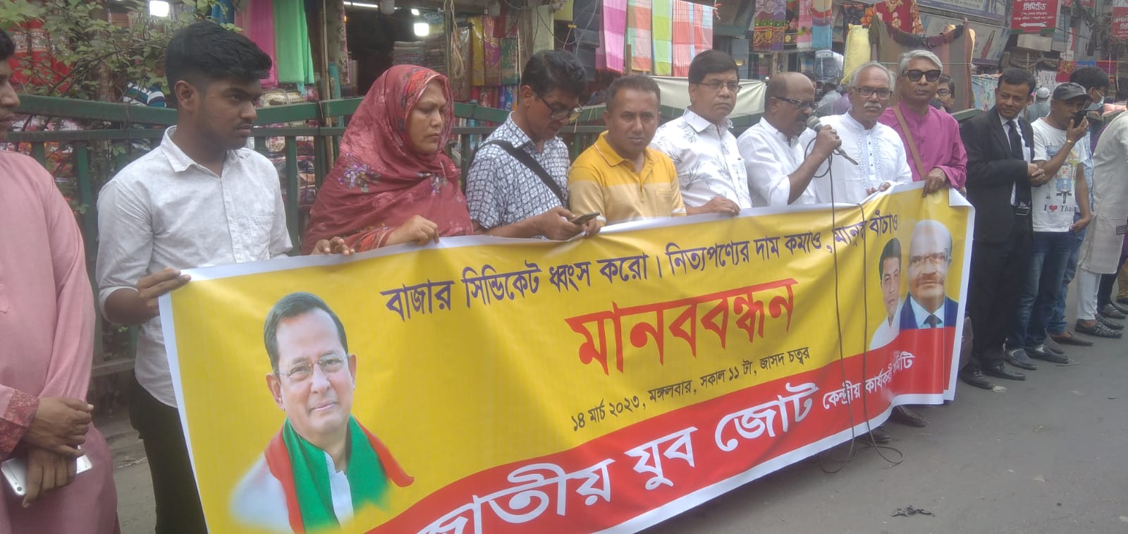 জনগণের শত্রু বাজার সিন্ডিকেট ধ্বংস ও নিত্যপণ্যের দাম কমানোর দাবিতে জাতীয় যুব জোটের মানববন্ধন ও বিক্ষোভ মিছিল