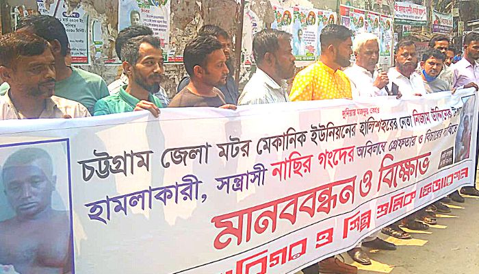 মানববন্ধনে বক্তারা বলেন, জাতীয় কারিগর ও শিল্প শ্রমিক ফেডারেশনের অন্তর্ভুক্ত চট্টগ্রাম জেলা মটর ওয়ার্কশপ মেকানিক্স ইউনিয়নের সহ-সভাপতি হালিশহর ২৬নং ওয়ার্ডে বসবাসরত নিজাম উদ্দিনকে গত ০৯/০৩/২০১৩ইং প্রকাশ্য দিবালোকে চট্টগ্রামের হালিশহরে সন্ত্রাসী নাসির উদ্দিন হত্যার উদ্দেশ্যে কুপিয়ে লোতর আহত করে। দীর্ঘদিন যাবত নিজাম উদ্দিনের কাছে সন্ত্রাসী নাসির বাহিনী চাঁদা দাবি করে আসছিল। আহত নিজাম উদ্দিন বর্তমানে চট্টগ্রাম মেডিকেল কলেজে মৃত্যুর সাথে পাঞ্জা লড়ছে।