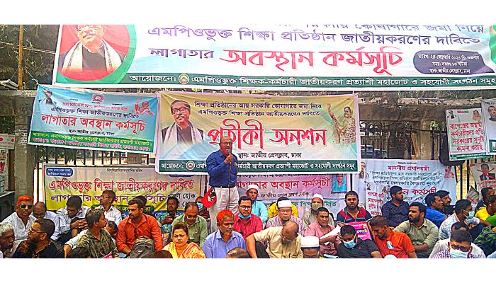 নিজস্ব প্রতিবেদকঃ এমপিওভুক্ত শিক্ষা জাতীয়করণ প্রত্যাশী মহাজোটের নেতৃত্বে গত ২৪ ফেব্রুয়ারি থেকে জাতীয় প্রেসক্লাবের সামনে এমপিওভুক্ত শিক্ষা জাতীয়করণের একদফা দাবিতে লাগাতার অবস্থান কর্মসূচি চলছে। আজ প্রতীকী অনশনের ৫ম দিন। সমগ্র দেশ থেকে কয়েক হাজার শিক্ষক-কর্মচারী প্রতিনিধিবৃন্দ এ আন্দোলনে প্রতিদিনই অংশ গ্রহণ করছে।