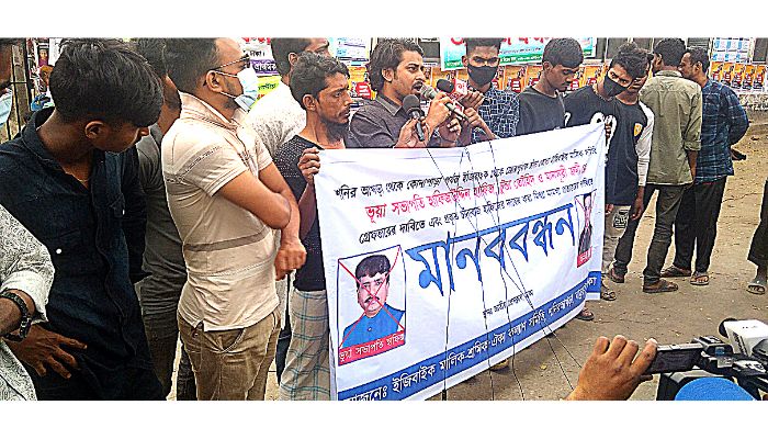 আমরা পরবর্তীতে প্রকৃত মালিক শ্রমিকরা কোন উপায়ান্তর না পেয়ে আজ মানববন্ধনে শামিল হয়েছি। আমরা দিন এনে দিন খেটে খাওয়া অসহায় মানুষ। যে সকল নেতৃবৃন্দ আমাদের অধিকার আদায়ে সবসময় সোচ্চার থেকেছে তাদেরকে মিথ্যা মামলা দিয়ে হাফিজ উদ্দিন হাফিজ জোরপূর্বক চাঁদাবাজি করছে। আমরা এর প্রতিকার চাই।