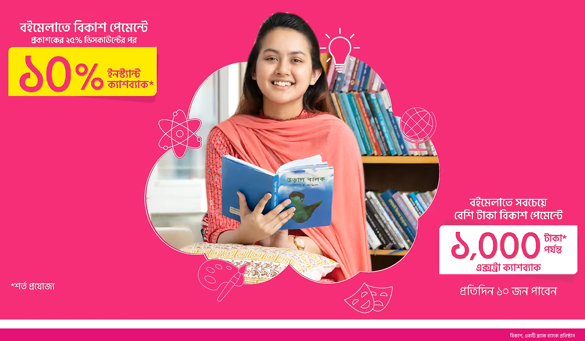 বইমেলার অধিকাংশ স্টলেই বিকাশ অ্যাপে কিউআর কোড স্ক্যান করে, *২৪৭# ডায়াল করে অথবা পেমেন্ট গেটওয়ের মাধ্যমে পেমেন্ট করে ইনস্ট্যান্ট ক্যাশব্যাক পাবেন গ্রাহক। প্রকাশক ও বিক্রেতাদের দেয়া ছাড়ের পাশাপাশি বিকাশ পেমেন্টে পাওয়া এই ইন্সট্যান্ট ক্যাশব্যাক পাঠকদের আরো বেশী বই কেনার সুযোগ করে দেবে। অফারগুলোর বিস্তারিত জানা যাবে https://www.bkash.com/bn/book_fair_2022 – এই লিংকে।