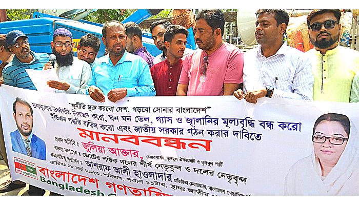 বাংলাদেশ গণতান্ত্রিক মুক্তি আন্দোলন (বিজিএমএ) এর চেয়ারম্যান মোঃ আশরাফ হাওলাদারের সভাপতিত্বে মানববন্ধনে আরো বক্তব্য রাখেন বাংলাদেশ নাগরিক জোট (বিএনজে) এর চেয়ারম্যান সিদ্দিকুর রহমান খোরশেদ, বাংলাদেশ লেবার পার্টির মহাসচিব আব্দুল্লাহ আল মামুন, বাংলাদেশ গণতান্ত্রিক মুক্তি আন্দোলন (বিজিএমএ) এর ভাইস চেয়ারম্যান মো: হোসেন লিটন, ভারপ্রাপ্ত মহাসচিব তোজাম্মেল হক, বাংলাদেশ গণতান্ত্রিক মুক্তি শ্রমিক আন্দোলনের সভাপতি আলমগীর হোসেন মন্ডল, বাংলাদেশ গণতান্ত্রিক মুক্তি যুব আন্দোলনের সভাপতি আবুল বাশার সহ দলের অন্যান্য নেতৃবৃন্দ।