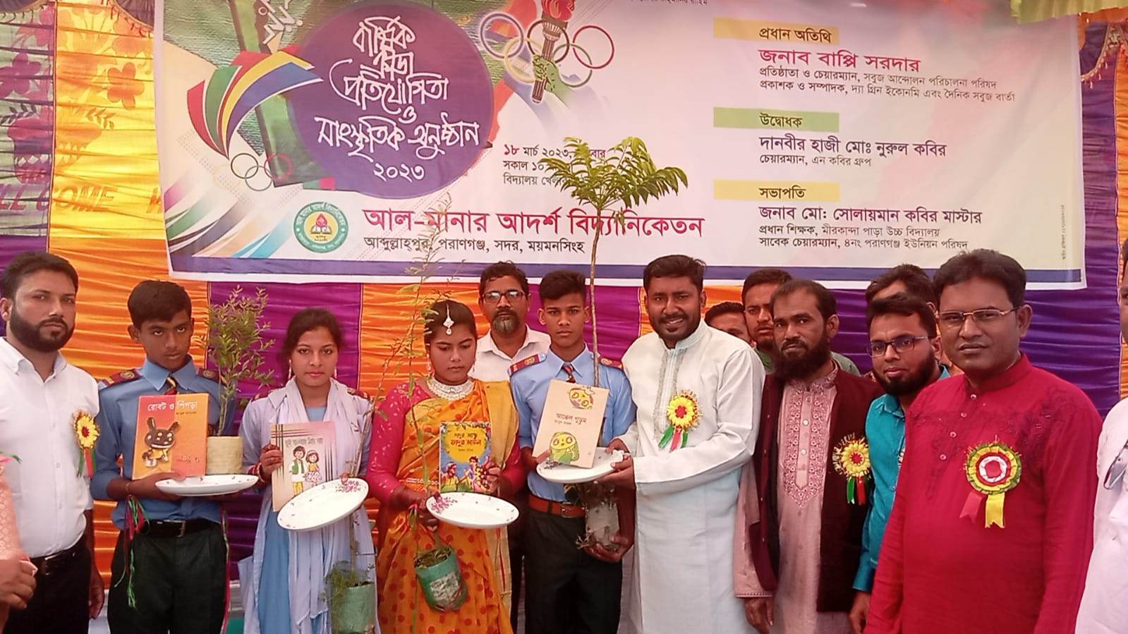 নিজস্ব প্রতিবেদকঃ ময়মনসিংহ সদর উপজেলা চরাঞ্চলের ৪নং পরানগঞ্জ ইউনিয়নে আজ ১৮ মার্চ দিনব্যাপী আল—মানার আদর্শ বিদ্যানিকেতনে ১৩তম বার্ষিক ক্রীড়া প্রতিযোগিতা ও সাংস্কৃতিক অনুষ্ঠান অনুষ্ঠিত হয়েছে। পরিবেশবাদী সংগঠন সবুজ আন্দোলনের পক্ষ থেকে বিজয়ী শিক্ষার্থীদের মাঝে মহামূল্যবান বই ও পরিবেশ বান্ধব গাছের চারা উপহার দেওয়া হয়। বার্ষিক ক্রীড়া প্রতিযোগীতা ও সাংস্কৃতিক অনুষ্ঠানে বিদ্যালয়ের ম্যানেজিং কমিটির সভাপতি সাবেক চেয়ারম্যান মোঃ সোলায়মান কবির মাষ্টারের সভাপতিত্বে প্রধান অতিথি হিসেবে উপস্থিত ছিলেন সবুজ আন্দোলনের প্রতিষ্ঠাতা ও পরিচালনা পরিষদের চেয়ারম্যান মোঃ বাপ্পি সরদার।