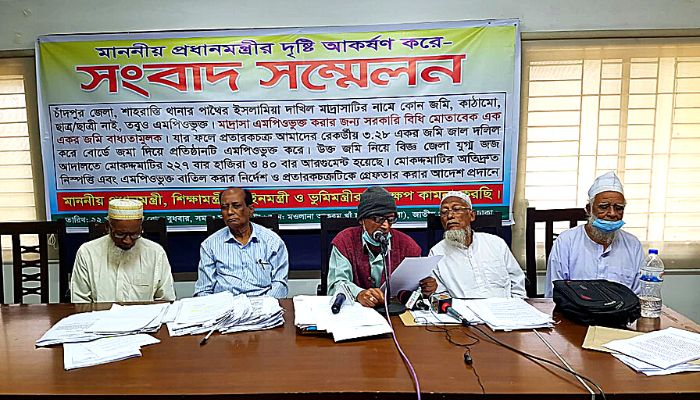 সংবাদ সম্মেলনে বক্তারা অভিযোগ করে বলেন, চাঁদপুর জেলা শাহরাস্তি থানার পাথৈর ইসলামিয়া দাখিল মাদ্রাসাটির নামে কোন জমি, কাঠামো, ছাত্র নাই তবুও এমপিওভুক্ত। মাদ্রাসা করা ও এমপিওভুক্তির জন্য সরকারী নীতিমালা মতে ১ একর জমি বাধ্যতামুলক। যার ফলে প্রতারকচক্র আমাদের রেকর্ডীয় ৩.২৮ একর জমি জাল দলিল করে বোর্ডে জমা দিয়ে প্রতিষ্ঠানটি এমপিওভুক্ত করে ১ যুগেরও বেশী সময় ধরে সরকারের চোখে ধুলা দিয়ে বেতন ভাতা উত্তলোন করে আসছে। উক্ত জমির জাল দলিল বাতিলের জন্য চাঁদপুর বিজ্ঞ জেলা যুগ্ম জজ আদালতে মোকদ্দমাটির ২২৭ বার হাজিরা ও ৪০ বার আরগুমেন্ট হয়েছে। মোকদ্দমাটিতে প্রতারকচক্র ৫০ বারের বেশি উকিল দ্বারা সময় নিয়েছে।