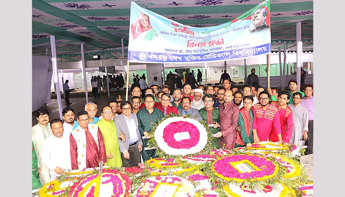 জাতীয় গুরুত্বপূর্ণ ও ঐতিহাসিক এই দিবস উপলক্ষে আজ রবিবার ২৬ মার্চ ২০২৩ইং তারিখ, সকাল ৬টা ২৫ মিনিটে বিশ্ববিদ্যালয় ক্যাম্পাসের শেখ রাসেল ফোয়ারার সম্মুখে জাতীয় পতাকা ও বিশ্ববিদ্যালয়ের নিজস্ব পতাকা উত্তোলন করা হয়। এরপর সকাল ৬টা ৩০ মিনিটে বি ব্লকের নীচে স্থাপিত সর্বকালের সর্বশ্রেষ্ঠ বাঙালি জাতির জনক বঙ্গবন্ধুর ম্যূরালে ও সি ব্লকের সামনে স্থাপিত বঙ্গবন্ধুর প্রতিকৃতিতে অত্র বিশ্ববিদ্যালয়ের মাননীয় উপাচার্য অধ্যাপক ডা. মোঃ শারফুদ্দিন আহমেদ এর নেতৃত্বে সম্মানিত উপ-উপাচার্যবৃন্দ, কোষাধ্যক্ষ, ডীনবৃন্দ, রেজিস্ট্রার, প্রক্টর, পরিচালকবৃন্দ, বিভিন্ন বিভাগের চেয়ারম্যানবৃন্দ, অফিস প্রধানগণ, শিক্ষকবৃন্দ, ছাত্রছাত্রী, চিকিৎসক, কর্মকর্তা, নার্স, মেডিক্যাল টেকনোলজিস্ট ও কর্মচারীবৃন্দ পুষ্পস্তবক অপর্ণের মাধ্যমে শ্রদ্ধাঞ্জলি নিবেদন করেন। পরবর্তীতে সাভার জাতীয় স্মৃতিসৌধে এবং ধানমন্ডি ৩২ নম্বর রোডস্থ বঙ্গবন্ধুর প্রতিকৃতিতে পুষ্পস্তবক অর্পণের মাধ্যমে শ্রদ্ধাঞ্জলি নিবেদন করা হয়।