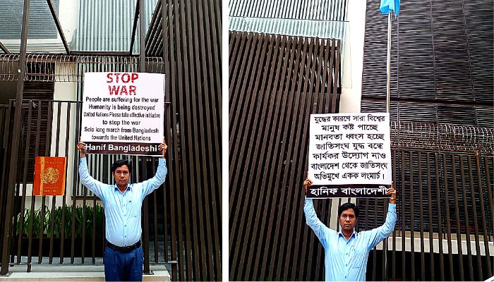 নিজস্ব প্রতিবেদকঃ ইউক্রেন—রাশিয়াসহ বিশ্বের বিভিন্ন দেশে যে যুদ্ধ অবস্থা বিরাজ করছে এতে সারা বিশ্বের মানুষ কষ্ট পাচ্ছে, এবং মানবতা ধ্বংস হচ্ছে। যুদ্ধ বন্ধে কার্যকর উদ্যোগ নিতে আজ ২৭ মার্চ (সোমবার) রাজধানীর গুলশানস্থ জাতিসংঘের বাংলাদেশ অফিসের সামনে ২ ঘন্টা অবস্থান কর্মসূচি পালন করে প্রতিবাদ জানিয়েছে অ্যাক্টিভিস্ট হানিফ বাংলাদেশী। পরে তিনি জাতিসংঘের বাংলাদেশ প্রতিনিধিকে এ সংক্রান্ত একটি চিঠি দিয়েছেন।