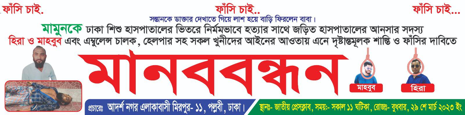 স্থানঃ জাতীয় পেসক্লাব সম্মুখে। সময়ঃ সকাল ১১ ঘটিকা, রোজ: বুধবার, তারিখঃ -২৯ মার্চ ২০২৩ই।