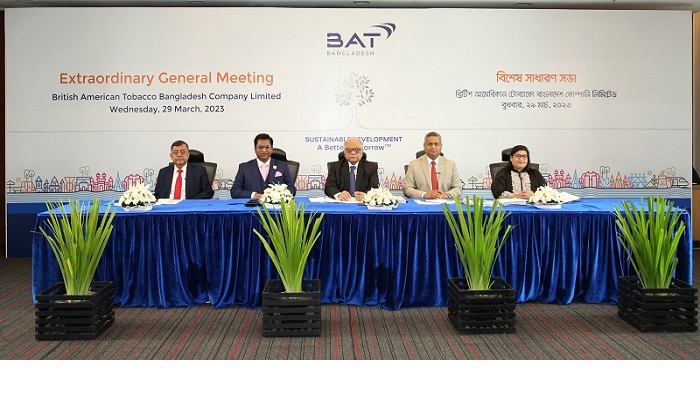 ব্রিটিশ আমেরিকান টোব্যাকো (বিএটি) বাংলাদেশ কোম্পানি লিমিটেডের বিশেষ সাধারণ সভা (ইজিএম) অনুষ্ঠিত হয়েছে। দেশ ও বিদেশের বিভিন্ন স্থান থেকে উল্লেখযোগ্য সংখ্যক শেয়ারহোল্ডারদের উপস্থিতিতে আজ বুধবার (২৯ মার্চ) সকাল ১০:৩০ মিনিটে কোম্পানির এই বিশেষ সাধারণ সভা (ইজিএম) ভার্চুয়ালি অনুষ্ঠিত হয়।