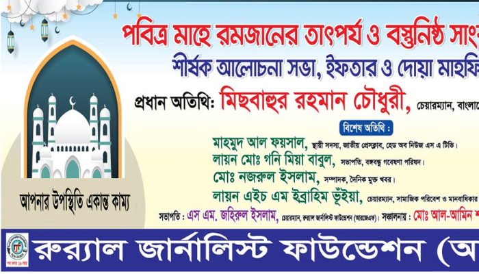 অনুষ্ঠানে সভাপতিত্ব করবেন আরজেএফ’র চেয়ারম্যান এস এম জহিরুল ইসলাম। যৌথসভা ও ইফতার মাহফিলে আমন্ত্রিত অতিথিদের যথা সময়ে উপস্থিত হওয়ার জন্য আরজেএফ’র ভারপ্রাপ্ত মহাসচিব মোঃ আল-আমিন শাওন সকলের প্রতি আহ্বান জানিয়েছেন।