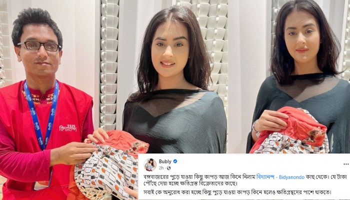 বুধবার (৫ এপ্রিল) বুবলী এক ফেসবুক পোস্টে জানিয়েছেন, বঙ্গবাজারে পুড়ে যাওয়া কিছু কাপড় বিদ্যানন্দ ফাউন্ডেশনের কাছ থেকে কিনে নিয়েছেন তিনি। যে টাকা পৌঁছে দেয়া হচ্ছে ক্ষতিগ্রস্ত বিক্রেতাদের কাছে। পাশাপাশি সবাইকে অনুরোধ জানিয়েছেন পুড়ে যাওয়া কিছু কাপড় কিনে হলেও ক্ষতিগ্রস্তদের পাশে থাকতে।