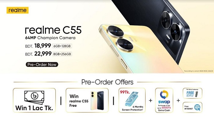 এসব অফারের পরও, একজন সৌভাগ্যবান বিজয়ীর জন্য থাকছে ১ লাখ টাকা জিতে নেয়ার সুবর্ণ সুযোগ। এছাড়া, লটারিতে বাছাইকৃত কয়েকজন ক্রেতা রিয়েলমি সি৫৫ ফোনটি পাবেন একদম ফ্রি। পাশাপাশি, প্রি-অর্ডারের ক্ষেত্রে ১,০০০ ক্রেতা পাবেন ফ্রি রিয়েলমি স্পোর্টস বোতল। বিজয়ীদের লটারির মাধ্যমে বাছাই করা হবে।