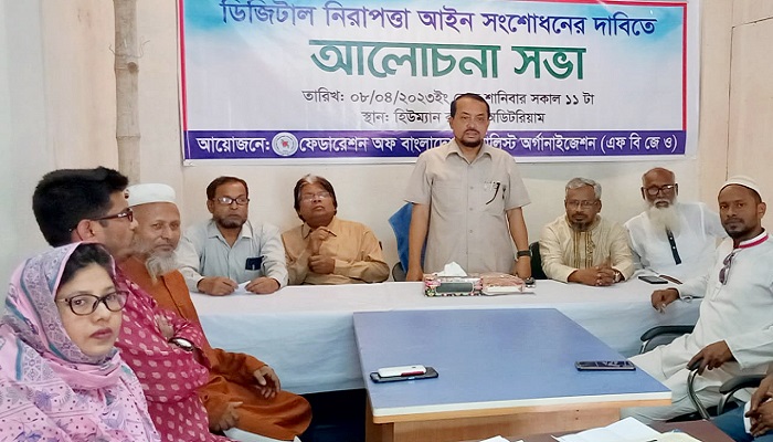 তিনি আরো বলেন এ আইনগুলি অবিলম্বে সংশোধন করার জন্য এফবিজেও’র সংগঠনের পক্ষ হতে সরকারের প্রতি জোর দাবি জানান। আলোচনা সভায় এফবিজেও’র চেয়ারম্যান লায়ন এইচ এম ইব্রাহিম ভূঁইয়া বলেন, আমরা অতীতে ডিজিটাল নিরাপত্তা আইন সংশোধনের দাবিতে কয়েকবার সরকারের সংশ্লিষ্ট মন্ত্রণালয়সহ বিভিন্ন দপ্তরে স্মারকলিপি দিয়েছি।