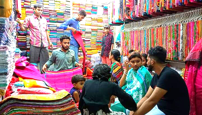প্রতিটি দোকানে শাড়ি, লুঙ্গি, থ্রিপিস, ফ্রক, প্যান্ট, শার্ট বেচাকেনার ধুম পড়েছে। ঈদে এছাড়া ফুটপাতের দোকানেও হকাররা বেচাকেনা করছেন বেশ। গরিব ও মধ্যবিত্ত পরিবারের লোকজন ফুটপাতের দোকান থেকে কম দামে কেনাকাটা সারছেন।