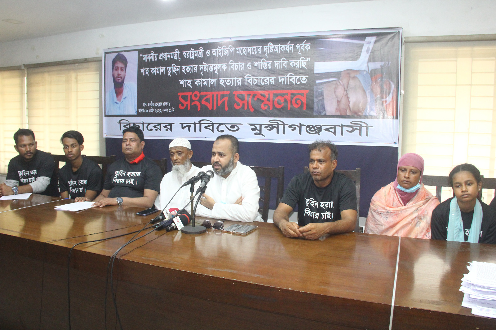 সংবাদ সম্মেলনে নিহত শাহ কামাল তুহিনের পিতা মোঃ আলম সরকার (আলমগীর সরকার) হত্যাকান্ডের লিখিত বক্তব্যে বলেন হৃদয়ের বেদনা নিয়ে জানাচ্ছি যে, আমার পুত্র তরুণ মেধাবী ছাত্র শাহ কামাল তুহিন (২৫), সাং- হাজী কেয়ালী রোড ফাজিল সরদার গলি পুকুরপাড়, পোঃ ফরিদাবাদ কদমতলী, ঢাকা। বর্তমানে সাং- মোল্লাকান্দি পোঃ-চর ডুমুরিয়া, থানা ও জেলা মুন্সীগঞ্জ। আমার ভাইয়ের ছেলে ফাহাদ (২৮) পিতা ফেরদৌস সরকার এবং আমার নাতী সবুজ (৩১) পিতাঃ বাতেন মিজি সহ টঙ্গীবাড়ী থানাধীন পুরা ডিসি উচ্চ বিদ্যালয়ের পাশে আমার ভাগ্নির স্বামী দুদু মিয়ার বাড়িতে বেড়াতে যাওয়ার পথে ১৩ মার্চ ২০২৩ সন্ধ্যা ৭-৪৫ মিনিটের সময় পুরা ডিসি উচ্চ বিদ্যালয়ের পুরাতন ভবনের পিছনে জনৈক ইসমাইল হোসেন খান বাবুর বালি ভরাটকৃত মাঠে পৌছানো মাত্র পূর্ব বিরোধকে কেন্দ্র করে আজাহারের নির্দেশে ২৫ জন একযোগে শাহ কামাল তুহিনকে সশস্ত্র আক্রমণ করে। আজাহার ও তাঁর ২৫ সহযোগী পূর্ব-পরিকল্পিতভাবে হত্যাকান্ড সংঘঠিত করার উদ্দেশ্যে রামদা, লোহার রড, চাইনিজ কুড়াল, চাঁপাতি, বাঁশের লাঠি, কাঠের ডাসা ও ককটেল সহ দেশীয় অস্ত্রে সজ্জীত হয়ে আজাহার মোল্লার হুকুমে বাবু কাজীর হাতে থাকা ধারালো রামদা দিয়ে আমার ছেলে শাহ কামাল তুহিনের মাথা লক্ষ্য করে হত্যা করার জন্য কোপ মারিলে মাথার উপরি ভাগে লাগলে গুরুতর জখম হয়। আজাহারের আরেক সহযোগী সিফাত সরদারের হাতে থাকা চাইনিজ কুড়াল দিয়ে মাথায় আবার আঘাত করলে আরো গুরুতর জখম হয়, আজাহারের আরেক সহযোগী সানি সরদার তার হাতে থাকা চাপাতি দিয়ে পিঠের নীচে আঘাত করলে গুরুত্বর জখম হয়। এরপর মাহমুদ্ উল্লাহ নামে আরেক জন লোহার রড দিয়ে তুহিনের ঘাড়ে বারবার আঘাত করলে ঘাড়ের রগ ছিড়ে রক্ত ঝরতে থাকে। জাকির ও নাজির নামে দুই জনের হাতে থাকা বাঁশের লাঠি ও তারকাটা যুক্ত কাঠের ডাসা দিয়ে পিঠে আঘাত করলে তারকাটা পিঠে ডুকে যায়। বারবার আক্রমণ ও আঘাতের ফলে এক পর্যায়ে শাহ কামাল তুহিন মাটিতে লুটিয়ে পড়লে জিয়া সরদার, শওকত দেওয়ান (মোক্তার হোসেন দেওয়ান), কামাল কাজী, রানা, অনিক, দরবার খান, নুরুদ্দিন, আইনুদ্দিন খান আমার ছেলে শাহ কামাল খান তুহিনের পিঠে, গলায় পেটে পারা দিয়া নাচঁতে থাকে। আমার ছেলে শাহ কামাল আক্রমণকারীদের কাছ থেকে ছুটে যাওয়ার চেষ্টা করলে আমানুউল্লাহ ও রহমত উল্লাহ তার পথরোধ করে রাখে এবং অন্য আরো সহযোগীরা আমার ছেলেকে বাচাঁতে আসলে ভাতিজা ফাহাদ ও নাতী সবুজকে এলোপাথাড়ী কিল ঘুষি ও লাথি মারিয়া তাদের শরীরের বিভিন্ন স্থানে নীলাফুলা জখম করে। পরে আমার ছেলে মারা গেছে মনে করিয়া চলে যায় এবং যাওয়ার সময় হৈ হুল্লোড় করিয়া নাচতে থাকে এবং বীরদর্পে ঘটনা স্থল ত্যাগ করে। পরে আমার ছেলেকে স্থানীয় লোকজনের সহায়তায় ও ভাতিজা ফাহ