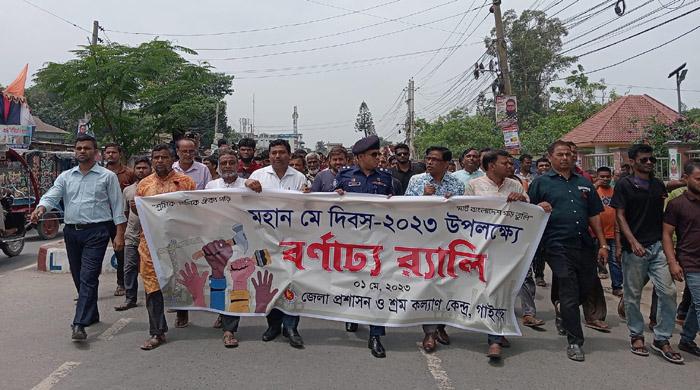 গাইবান্ধা জেলা প্রশাসন ও শ্রম কল্যান কেন্দ্র আয়োজনে সকালে স্বাধীনতা প্রাঙ্গন থেকে বর্ন্যাঢ্য শোভাযাত্রা শহর প্রদক্ষিন করে ।