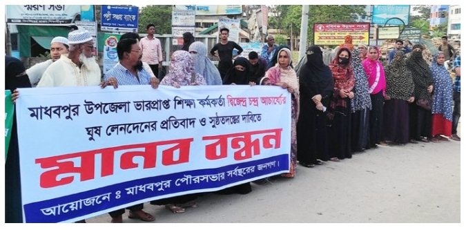 হবিগঞ্জ জেলা প্রতিনিধি: হবিগঞ্জের মাধবপুর উপজেলা ভারপ্রাপ্ত শিক্ষা কর্মকর্তা দ্বিজেন্দ্র চন্দ্র আচায্যের ঘুষ লেনদেনের প্রতিবাদ ও সুষ্ঠ তদন্তের দাবিতে মানববন্ধন করেছে এলাকাবাসী।