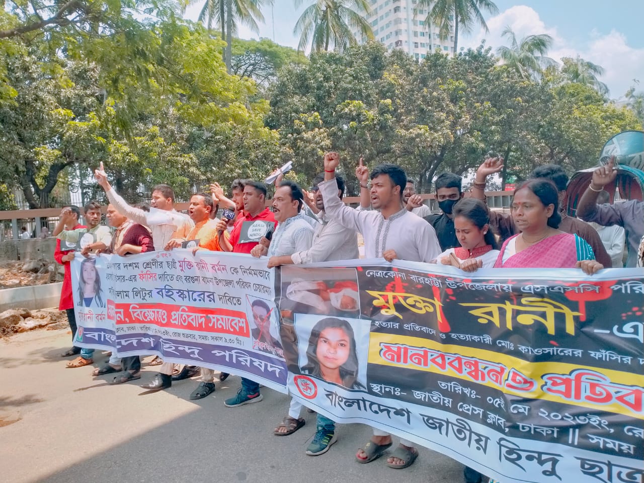 নিজস্ব প্রতিবেদকঃ অদ্য ০৫ মে ২০২৩, শুক্রবার সকাল ১০.৩০টায় জাতীয় প্রেসক্লাবের সামনে বাংলাদেশ হিন্দু পরিষদের কেন্দ্রীয় কমিটির সভাপতি দিপঙ্কর শিকদার দিপুর সভাপতিত্বে আয়োজিত নেত্রকোনা দশম শ্রেণীর ছাত্রী মুক্তি রানী বর্মনকে নির্মমভাবে কুপিয়ে হত্যার প্রতিবাদে ও খুনীর দৃষ্টান্তমূলক শাস্তি এবং অত্র মামলাটি দ্রুত বিচার ট্রাইব্যুনালে বিচারের দাবিতে এবং বরগুনা বামনা উপজেলা পরিষদের চেয়ারম্যান সাইতুল ইসলাম লিটু মৃধা কর্তৃক অত্র থানার পুলিশ কর্মকর্তাকে মালাউন বলে গালিগালাজ করায় তাকে বহিস্কারের দাবিতে মানববন্ধন, বিক্ষোভ ও প্রতিবাদ সমাবেশের আয়োজন করা হয়।